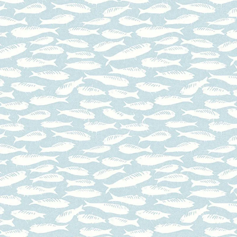Bring coastal charm to your interiors with this playful, Scandinavian-inspired design! A school of sardines are stamped in white against a light blue backdrop with delicate linen detailing. Nunkie is a prepasted, acrylic coated paper wallpaper.