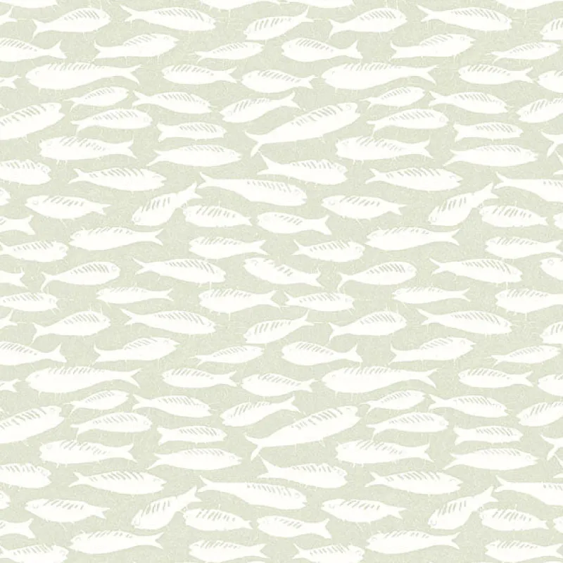 This playful, Scandinavian-inspired fish wallpaper is sure to delight! The school of small-frys are inked in white against a finely woven sage faux linen backdrop. Nunkie is a prepasted, acrylic coated paper wallpaper.