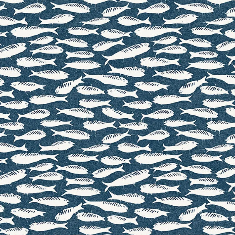 Add a playful touch to coastal interiors with this Scandinavian-inspired fish wallpaper. This school of small-frys is inked in white against a finely woven, deep blue faux linen background. Nunkie is a prepasted, acrylic coated paper wallpaper.