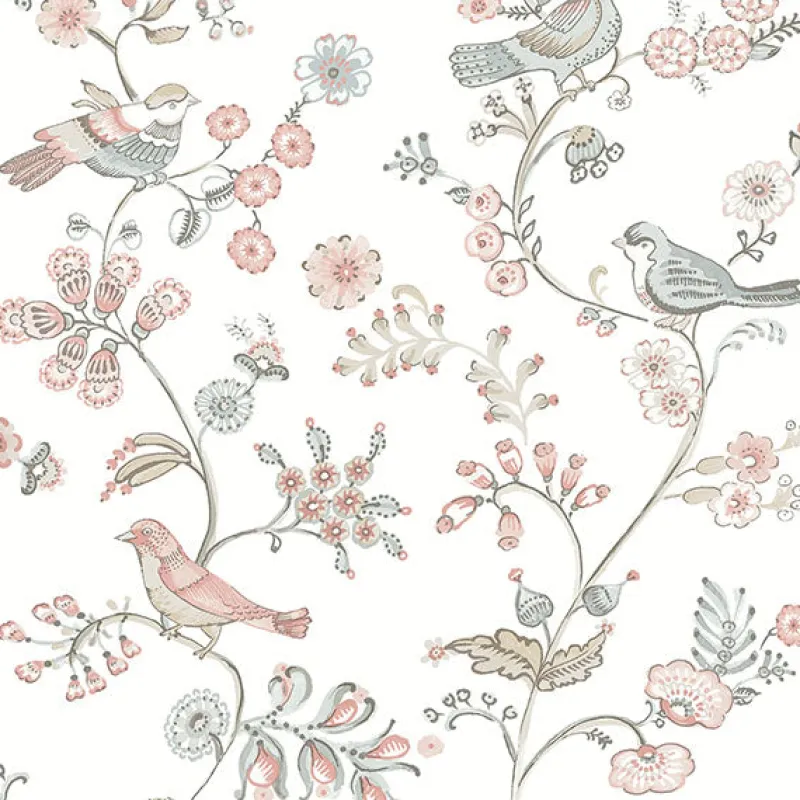 This sweet, illustrative wallpaper brings elevated country stylings to your walls. Twining vines are bursting with blush and blue blooms, with curious sparrows perched among the flowers. Jinjur is a prepasted, acrylic coated paper wallpaper.