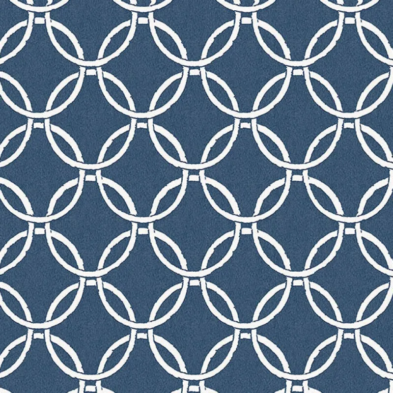 This geometric ogee is a perfect blend of modern simplicity and traditional design. Large white circles form an interlocking chain against a variegated navy backdrop. Quelala is a prepasted, acrylic coated paper wallpaper.