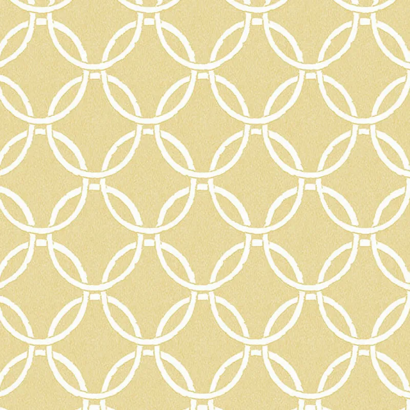 This geometric wallpaper perfectly balances traditional design with modern simplicity. The white circles form and interlocking chain against the sunny yellow backdrop. Quelala is a prepasted, acrylic coated paper wallpaper.