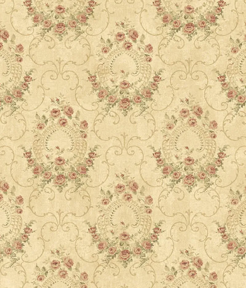 This elegant floral damask adds a rustic yet regal touch to your home. The pink roses are lovingly hand-painted, the vine-like scrolls adding light embellishment and the textural beige background augmenting its antique beauty. Georgiana is a prepasted, non woven wallpaper.