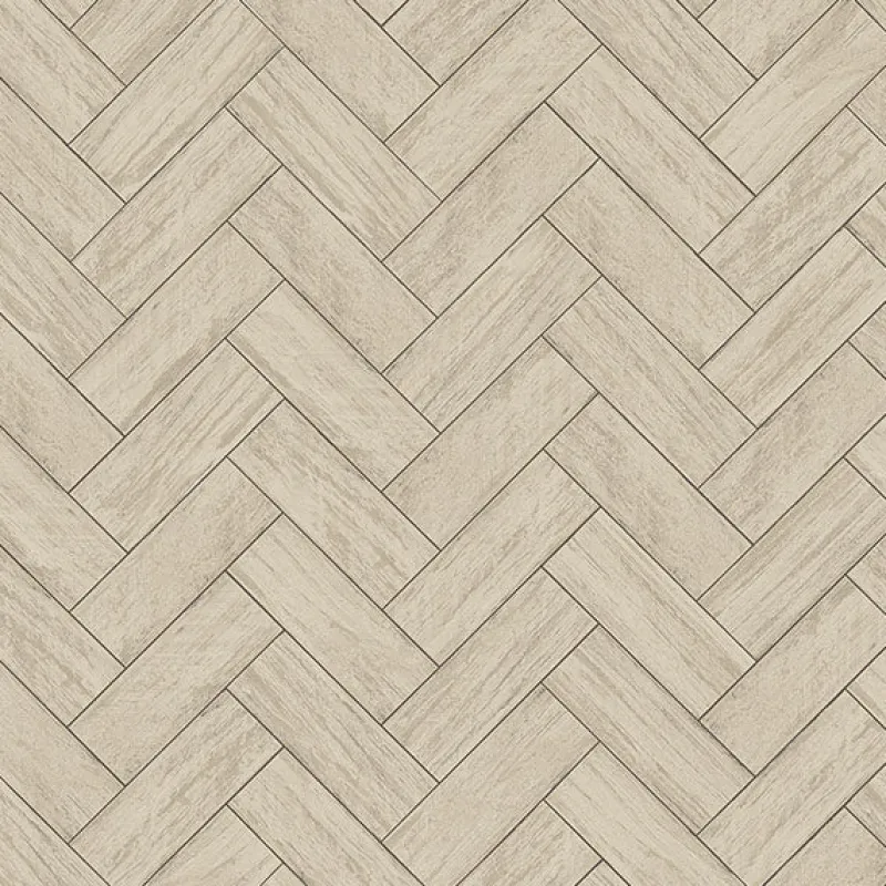 This sophisticated herringbone pattern is a perfect blend of modern and rustic. The taupe tiles are accented with dark beige woodgrain detailing that accented with a subtle raised ink texture. Kaliko is a prepasted, acrylic coated paper wallpaper.