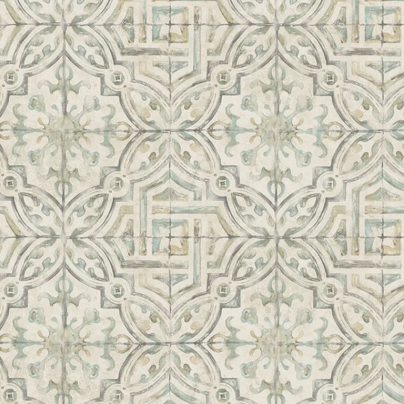 Add style and character to your home with this faux Spanish tile wallpaper. The elaborate geometric patterns are painted in a blend of muted greens, blues and greys against an off-white base. Sonoma is a prepasted, non woven wallpaper.