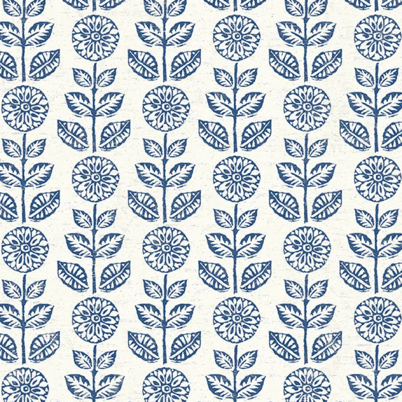This folksy floral is a surefire way to bring charm to your home! The dark blue dahlias seem to be block-printed in proud columns against a distressed white backdrop. Dolly is a prepasted, non woven wallpaper.