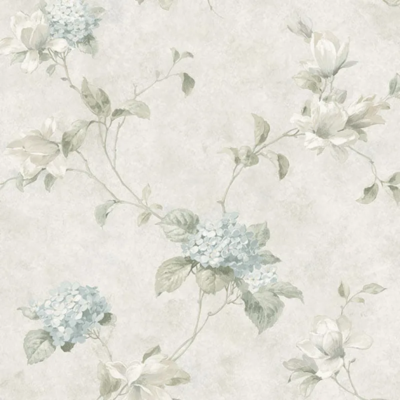 This floral wallpaper brings traditional elegance to your home. Beautiful bunches of blue hydrangeas blossom against a distressed taupe backdrop. Magnolia is a prepasted, non woven wallpaper.