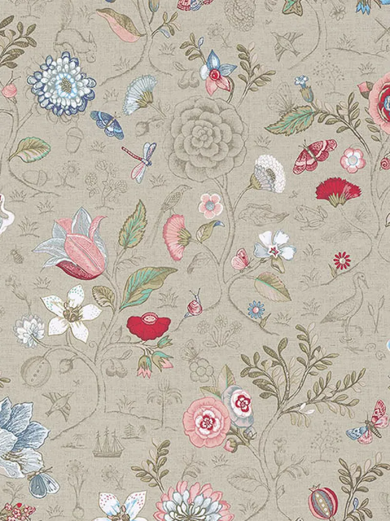 Vivid pink, red and blue forest flowers pop amongst woodland animals in this enchanting wallpaper. With a light brown background, this eclectic neutral wallpaper has a whimsical feel. Espen is an unpasted, non woven wallpaper.