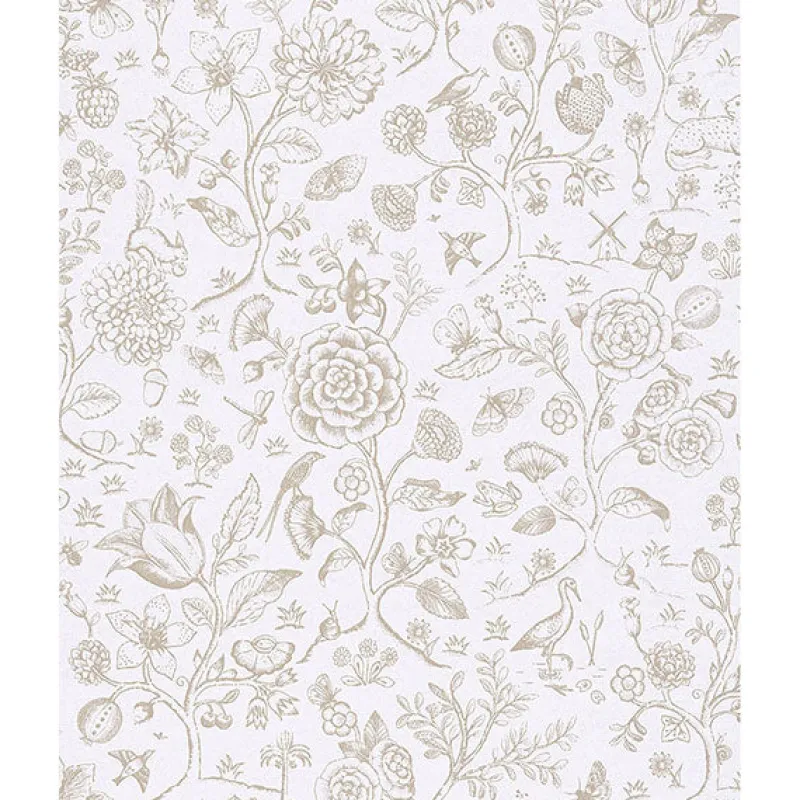 Charming woodland animals scurry amongst blooming flowers and forest trees in this whimsical wallpaper design by Eijffinger. With taupe raised ink, this eclectic wallpaper will add texture and charm to your walls. Ambroos is an unpasted, non woven wallpaper.