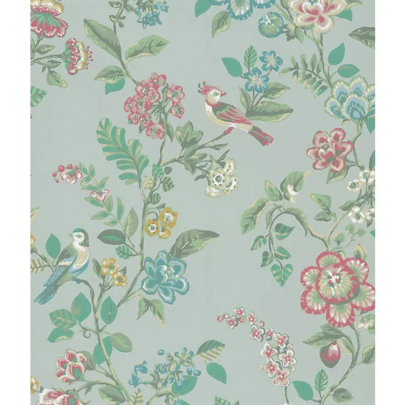 Bring an enchanting feel to your room with this whimsical light mint wallpaper design by Eijffinger. Pink and blue song birds perch upon curling green trails and vivid forest flowers. Willem is an unpasted, non woven wallpaper.