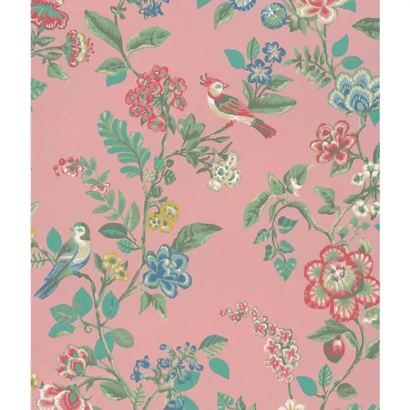 Rose and blue song birds rest amongst dreamy pink, cream and sky flowers in this fanciful wallpaper. Leafy mint trails create a lush garden scene reminiscent of fairy tales. Willem is an unpasted, non woven wallpaper.