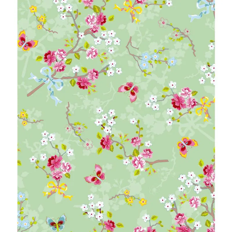 With metallic ink details, silvery flowers gleam amongst blue and pink butterflies in this mint eclectic wallpaper. In a rainbow of colors, bright cherry blossoms are tied with yellow and blue ribbon, creating a whimsical feel. Ilse is an unpasted, non woven wallpaper.