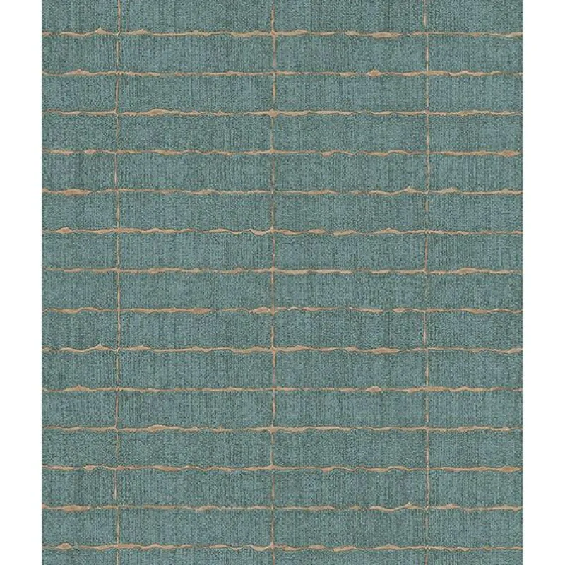Bring color and texture to your walls with this teal brick wallpaper. The rectangular bricks are accented by a gold grout lines in a modern grid print.