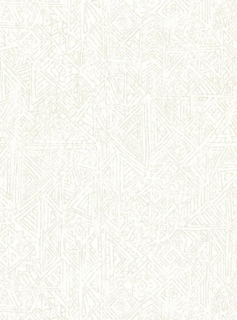 Global and glamorous styles combine with this stunning geometric wallpaper. A platinum background shimmers from behind a white tribal inspired print. Longmont is an unpasted, non woven wallpaper.
