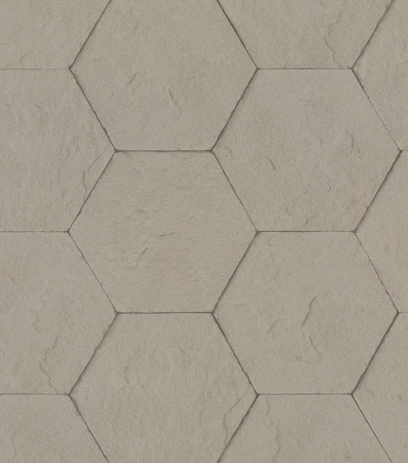 This hexagon stone tile wallpaper brings a modern touch to your home. The light grey tiles are embued with texture thanks to delicate raised ink stippling. Bascom is an unpasted, vinyl on non woven wallpaper.