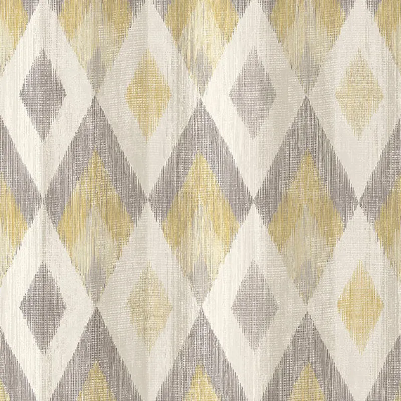 Warm yellows and neutral hues are beautifully blended in this geometric design. A variegated white and light grey backdrop is overlaid with a diamond motif featuring various yellow and grey shapes laid out in both concentric and overlapping patterns. A light dusting of glitter and thin strands of raised inks bring extra texture and dimension to the design. Ace is an unpasted, non woven wallpaper.