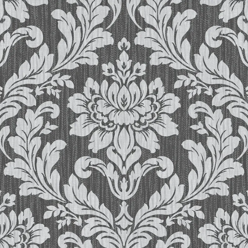 Give your home an elegant touch with this sophisticated damask print. The metallic silver motifs are comprised of a central flower and leafy scrolls, the bright silver a striking contrast against the charcoal backdrop. Galois is an unpasted, vinyl on paper wallpaper.
