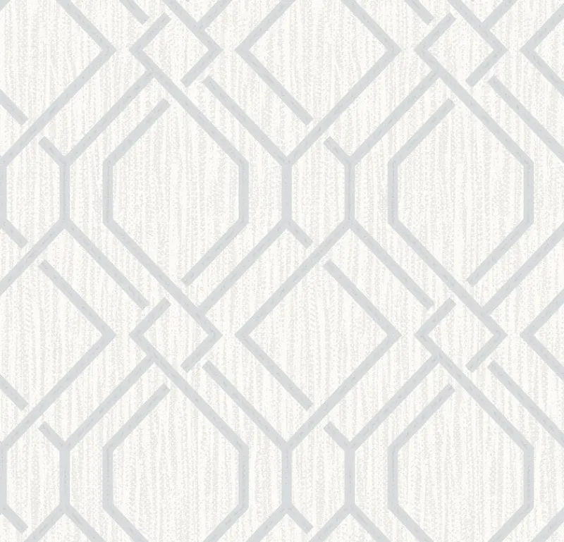 Add modern luxury to your interiors with this elegant trellis design. The silver geometrics are embellished with metallic ink and offset by a distressed off-white backdrop. Frege is an unpasted, vinyl on paper wallpaper.