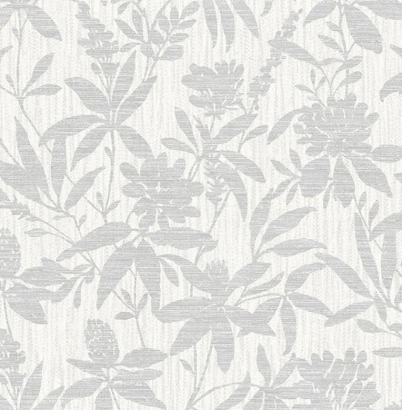 Enjoy traditional elegance with this floral silhouette print. Trails of silver leaves and flowers are accented by metallic raised inks and imprinted against the distressed off-white backdrop. Riemann is an unpasted, vinyl on paper wallpaper.