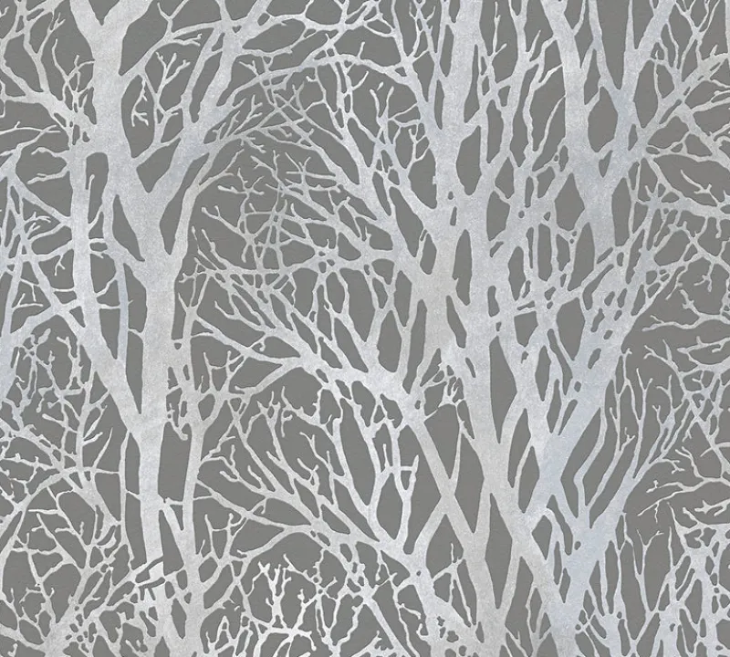 Enhance your walls with this elegant, botanical wallpaper. Each silver tree branch is pressed into the thick charcoal backdrop for a rich, dimensional look. Yasuo is an unpasted, vinyl on non woven wallpaper.