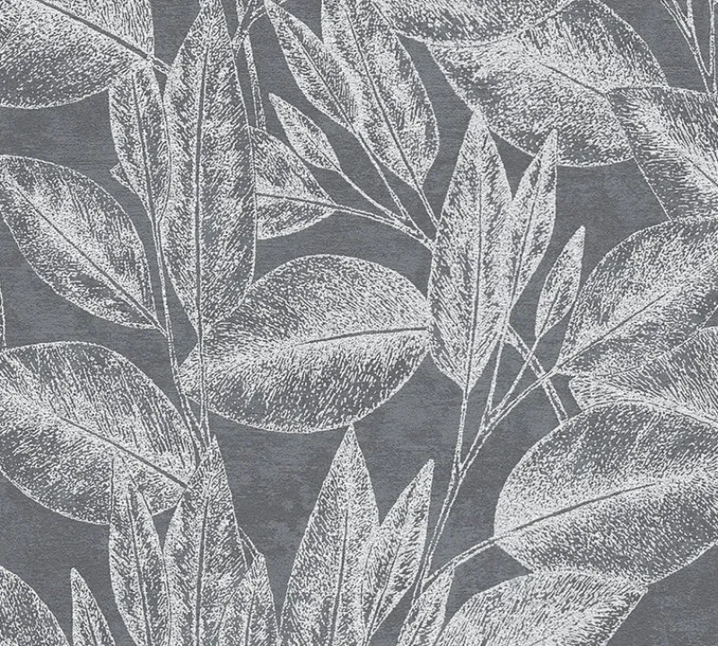 Dress your walls with modern elegance using this large tropical leaf design. Each silver leaf is finished with a metallic sheen and lies against a distressed charcoal backdrop. Suki is an unpasted, vinyl on non woven wallpaper.