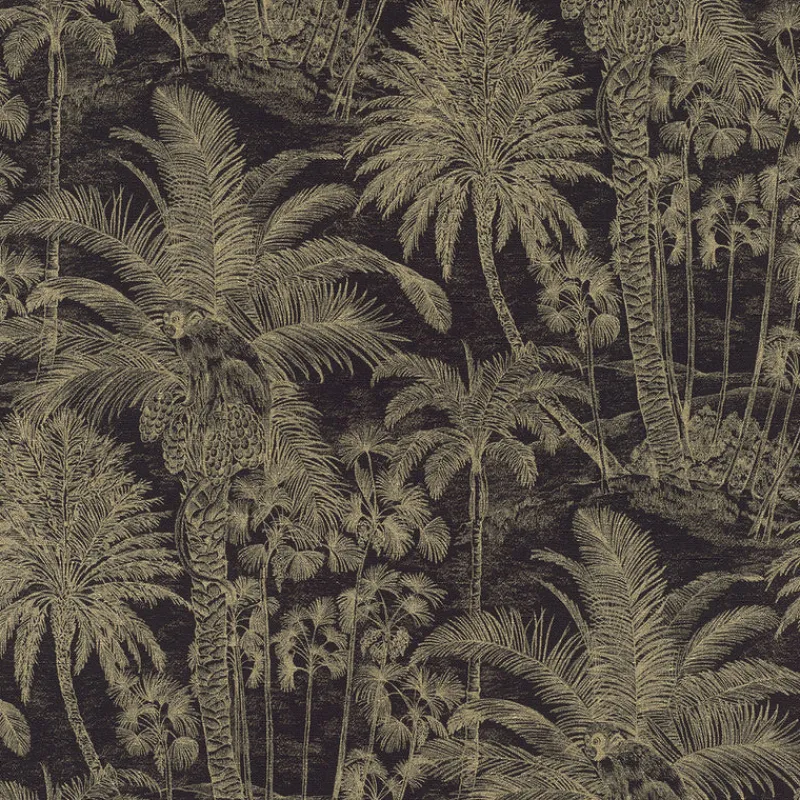 This mesmerizing botanical print is dripping in glamour. A scenic array of shimmering gold palm trees with perched monkeys combines with a black faux linen backdrop to create this dimensional, eclectic print. Yubi is an unpasted, vinyl on non woven wallpaper.