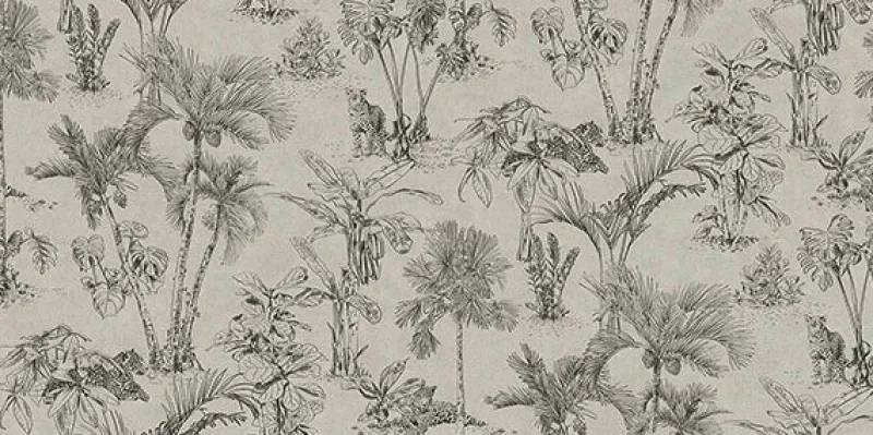 Embark on a jungle safari with this sophisticated illustrative design. The rainforest comes to life, with lush greenery and stalking jaguars inked in black against a taupe faux linen backdrop. Zapata is an unpasted, vinyl on non woven wallpaper.