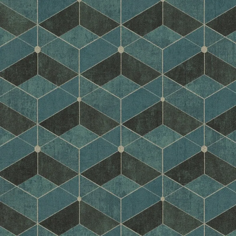 Add a touch of geometric glamour to your interior with this stunning wallpaper! The teal and dark green tiles are arranged in a way that provides a slight 3D effect, with muted gold outlining each shape. Muir is an unpasted, vinyl on non woven wallpaper.