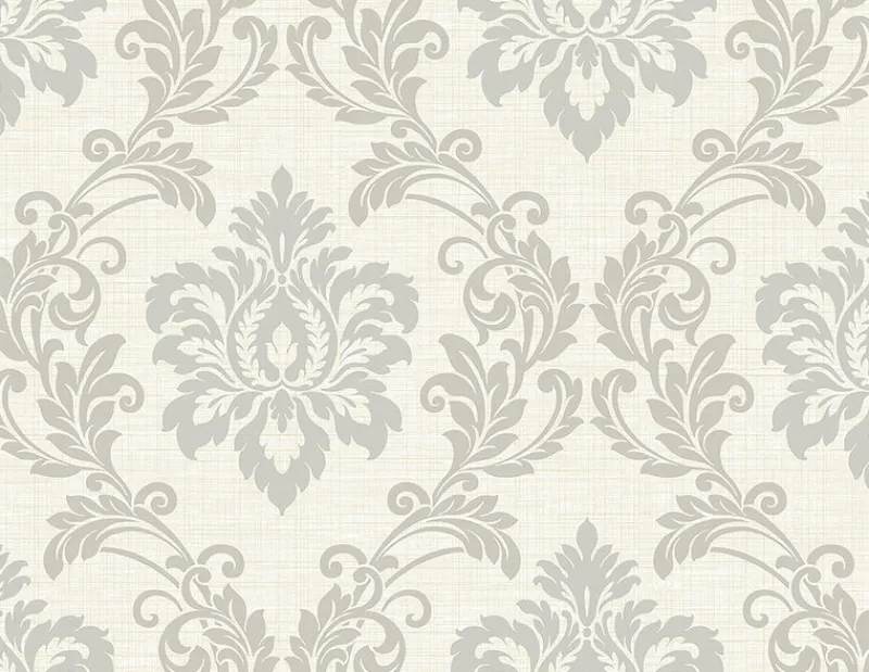Get the look of twill with this fabric inspired wallpaper. Grey damasks pop against an ivory background, while raised inks add a sense of texture. Adela is an unpasted, vinyl wallpaper.