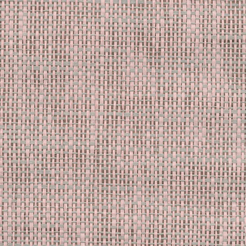 Layers of color and texture make up this pink grasscloth wallpaper. A brown bronze background creates shine while pink and grey strands of grass add a natural element.