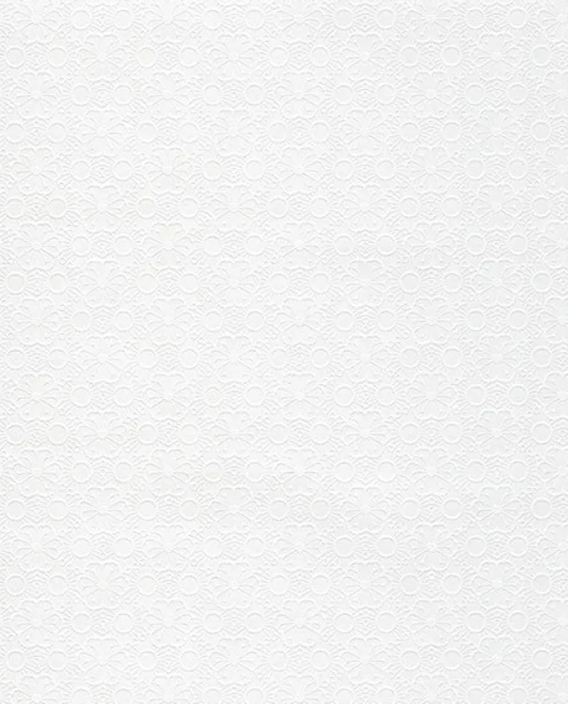 This wallpaper has a delicate floral pattern reminiscent of doily lace. A metallic platinum background adds a hint of shine beneath raised ink flowers and polka dots.