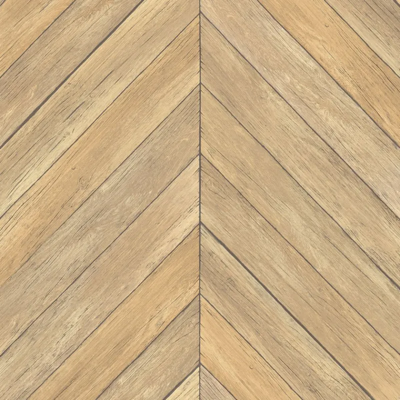 This wallpaper is designed to give the look of artisinal wood paneling. The planks are a mix of an inviting wheat color and natural wood tones. A chevron pattern is modern and looks impressive on walls.