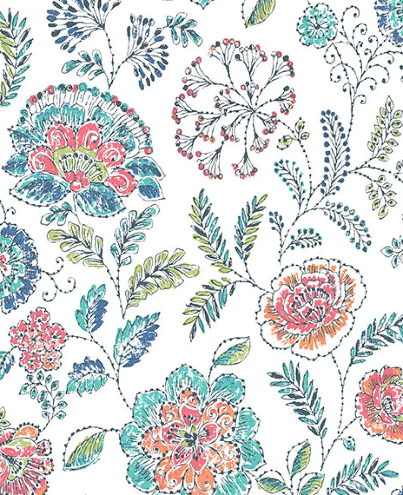 Hang a piece of art on your walls with this beautiful Jacobean wallpaper. The large scale print has a modern style with bright pink, orange, teal, and green hues. Tropez is a non woven, unpasted wallpaper.