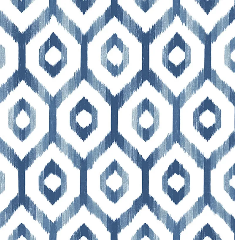 A chic diamond trellis wallpaper with a colorful stripe background. Shades of blue run together with an ikat texture. Lucia is a non woven, unpasted wallpaper.