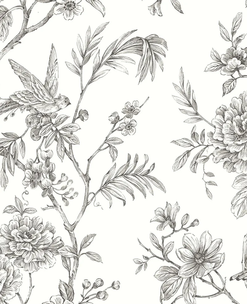 This large-scale trail wallpaper is enchanting and beautiful. The monochromatic color scheme makes the floral and bird design versatile.