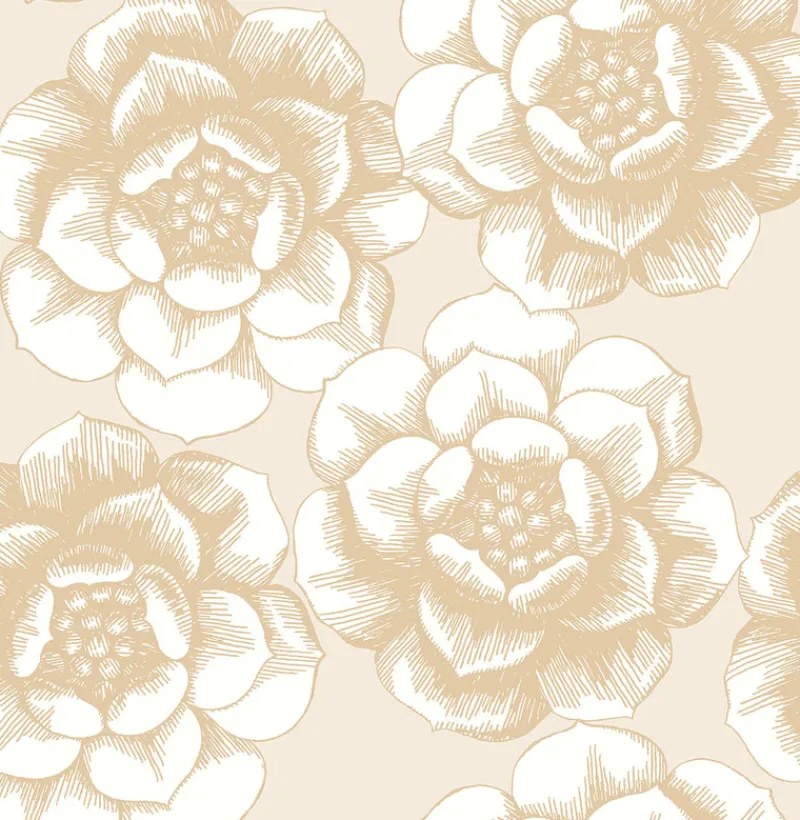 A high impact wallpaper that dazzles. Large-scale white and gold flowers bloom on a cream background.