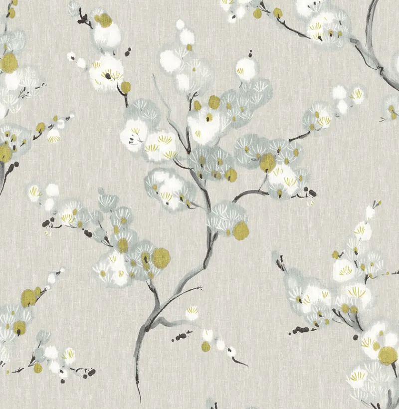 Influenced by Japanese art, this hand-painted pattern harkens to another era while remaining distinctly modern. The blue, yellow, and white blossoms decorate a cool grey linen print. Bliss is a unpasted, non woven wallpaper.