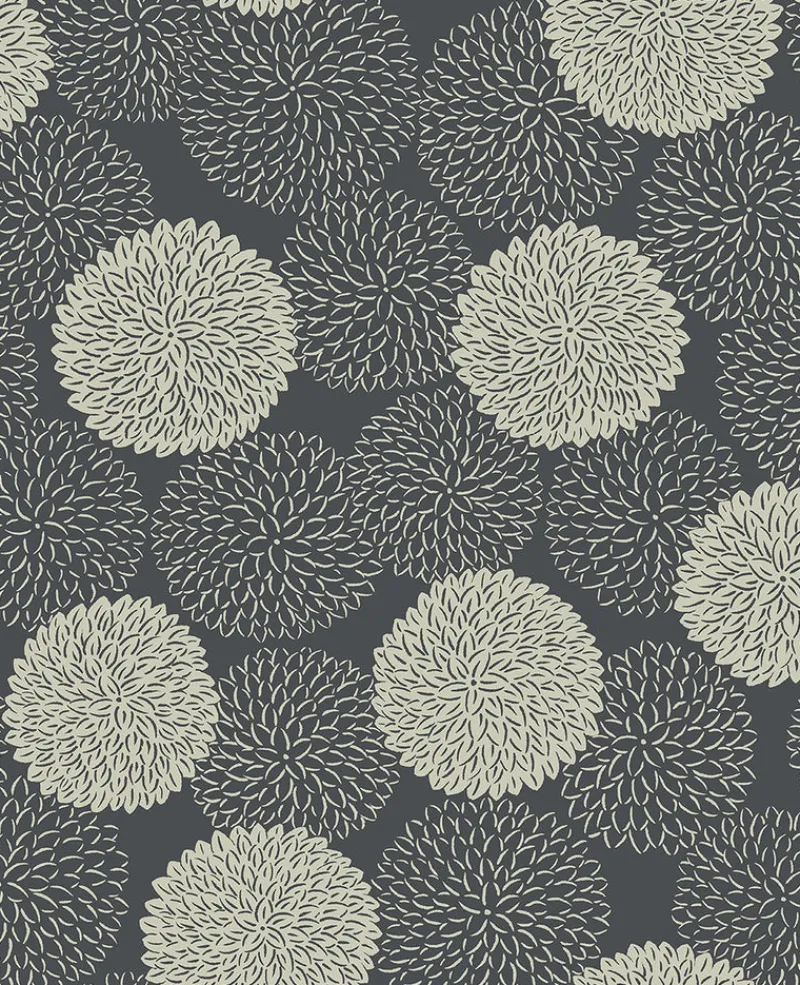 Drawing inspiration from the symbolism of chrysanthemums in Japanese culture, this floral wallpaper is strikingly beautiful. Longevity and rejuvenation are reflected in the shine of metallic silver ink over charcoal. Blithe is a unpasted, non woven wallpaper.