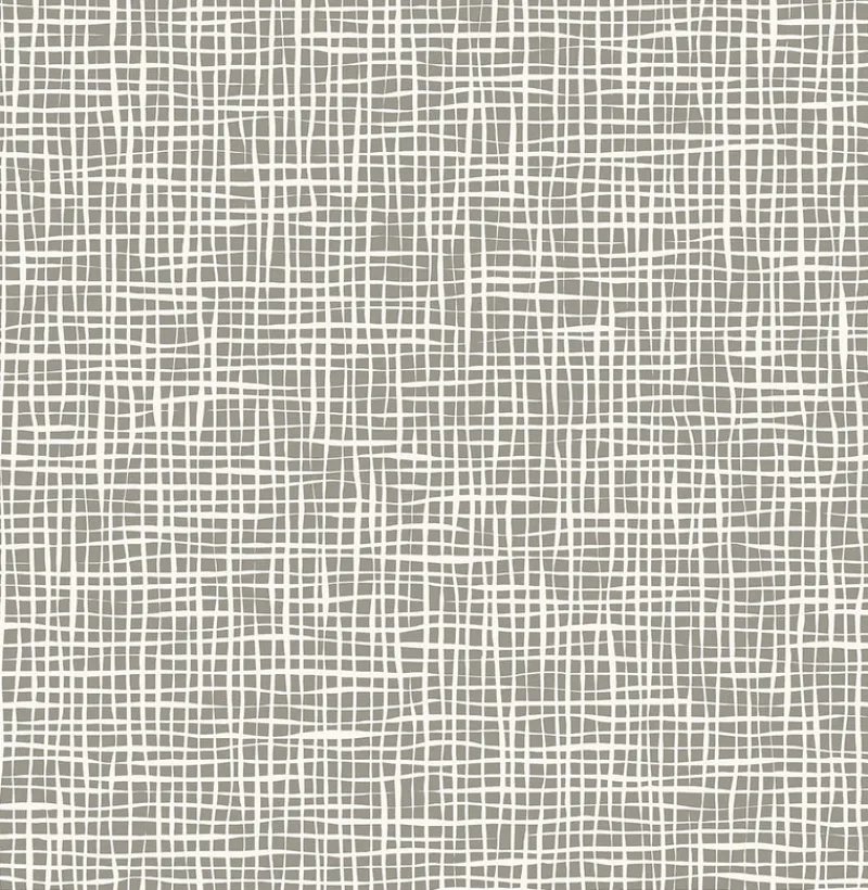 Loosely inspired by shoji panels, this modern wallpaper features a freeform grid pattern. White lines twist and weave over a grey background. Shanti is a unpasted, non woven wallpaper.