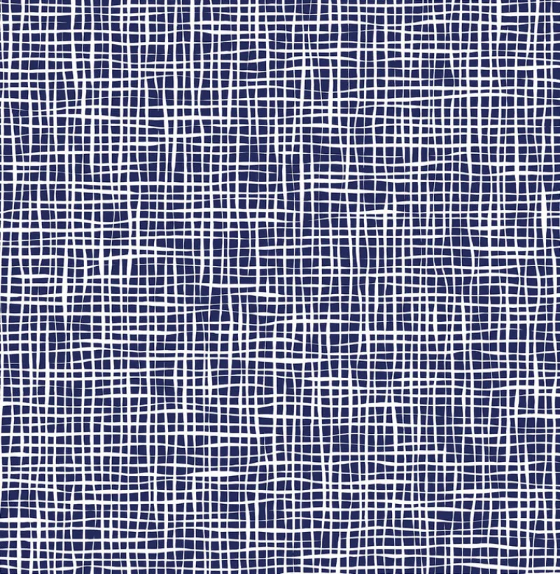 White lines pop against a deep blue background. The abstract grid design has roots in Japanese ink paintings and shoji panels. Shanti is a unpasted, non woven wallpaper.