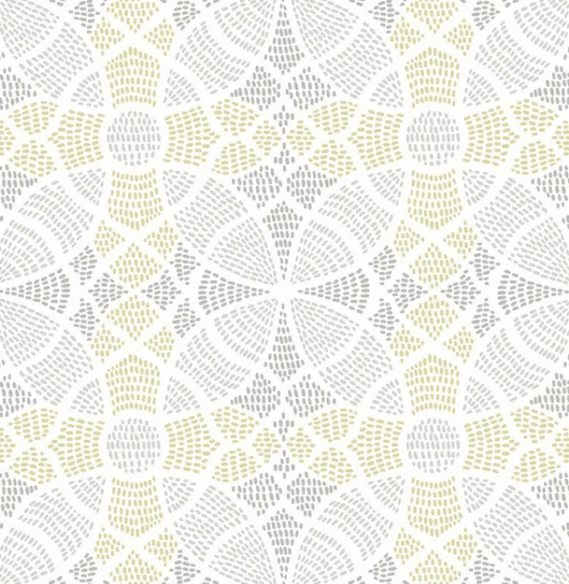 Dotted sections create the look of interlocking circles in this wallpaper. A darker grey is set apart from the goldenrod and light grey with a raised ink texture. Zazen is a unpasted, non woven wallpaper.