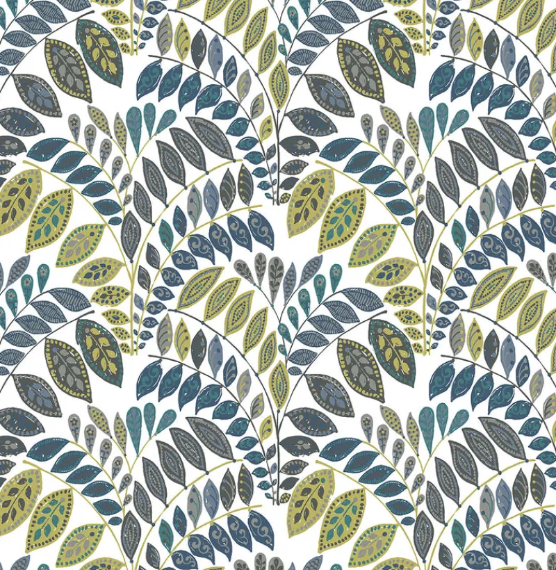 Breathe life into your decor with this upbeat and energetic botanical wallpaper. Rich green, navy and slate leaves with geometric accents unfurl from lively fronds, creating a dazzling nature inspired design. Fiddlehead is an unpasted, non woven wallpaper.