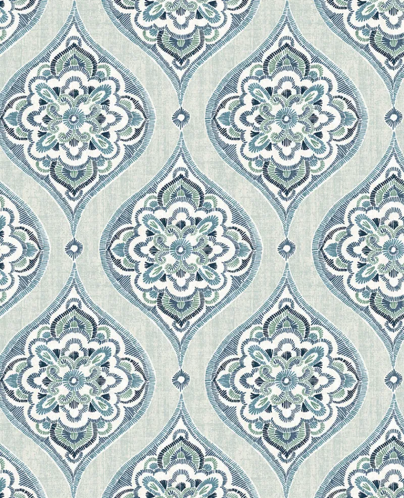 Bright and beautiful, this Scandinavian inspired print has a mixture of modern and classic elements. The design features hand drawn aqua, seafoam and navy damasks with an energetic, cool toned palette. Adele is an unpasted, non woven wallpaper.