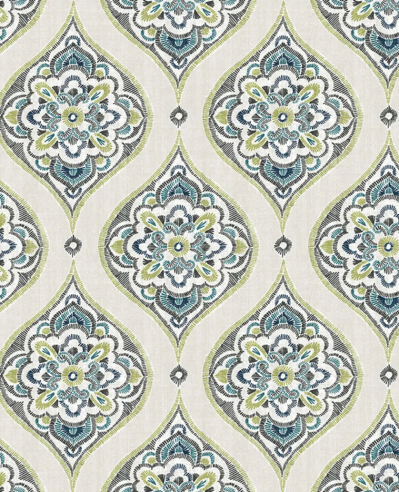 With turquoise, brown and green hues, this modern damask design has an organic flair. Its hand drawn style and fabric inspired background adds to its dimensional and whimsical look. Adele is an unpasted, non woven wallpaper.