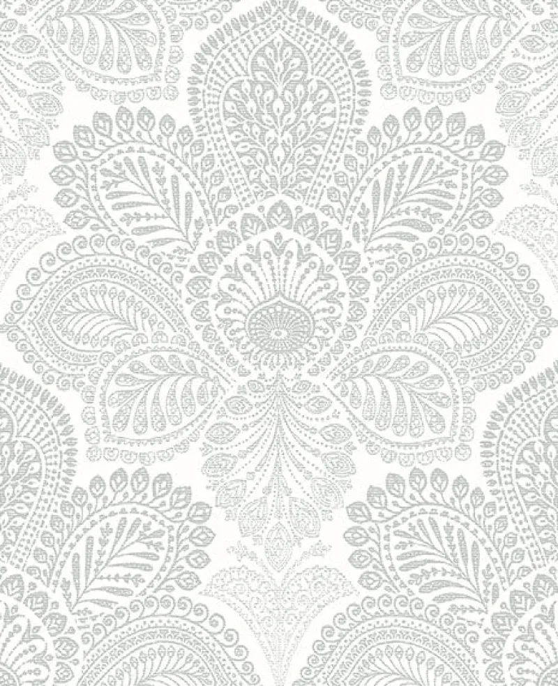 With a grey and white palette, this boho chic print radiates an effortless elegance. Grey floral medallions stun with raised inks and subtle distressing. Triumph is an unpasted, non woven wallpaper.