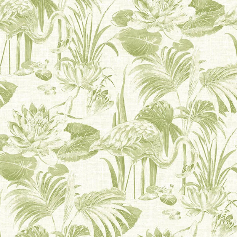 A green lagoon scene, complete with flamingos and tropical flora, effortlessly complements a neutral faux linen background. Its watercolor style lends to a chinoiserie inspired style. Frolic is an unpasted, non woven wallpaper.