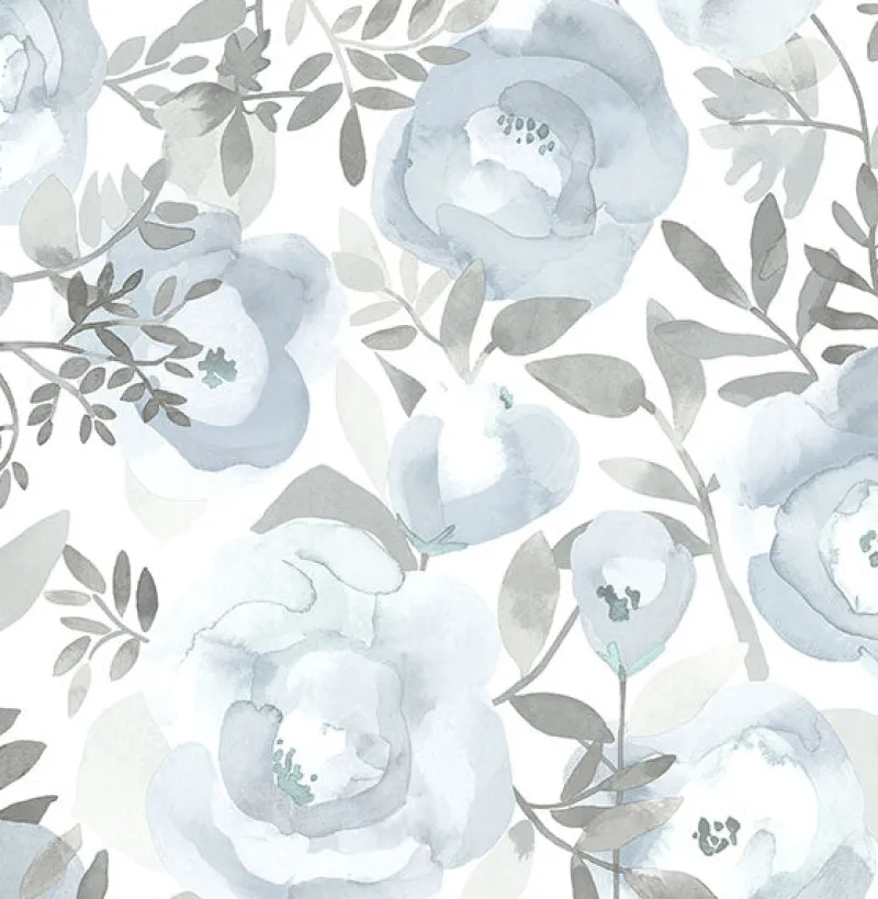 With dreamy blue roses and a watercolor style, this vintage inspired wallpaper has a soothing energy. Grey leaves and a crisp white backdrop effortlessly meld with its calming vibe. Orla is an unpasted, non woven wallpaper.