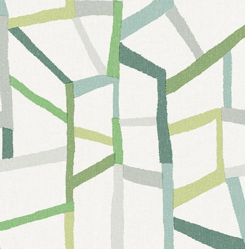 Bright green, teal and grey geometrics pop against an off-white background in this linen inspired design. Its woven pattern is complete with raised inks for a dimensional effect. Tate is an unpasted, non woven wallpaper.