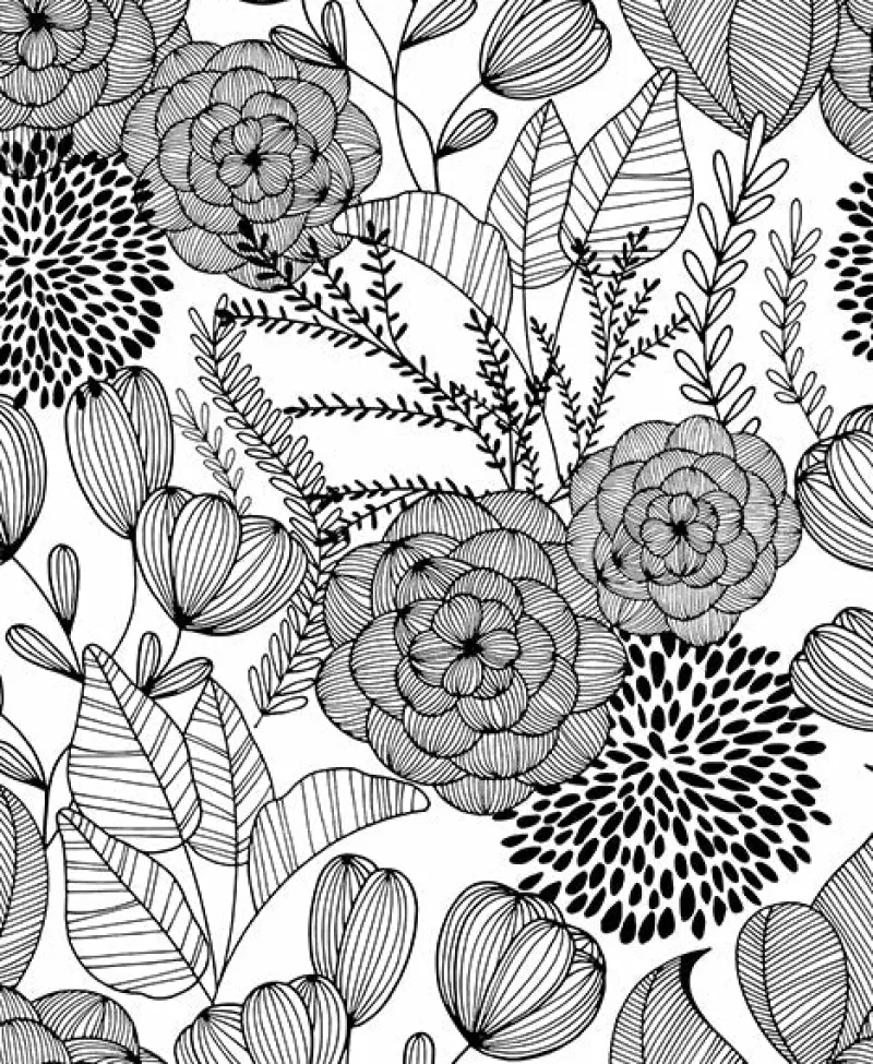 Effortlessly chic, this modern floral wallpaper has a timeless black and white palette. Blossoming chrysanthemums, tulips and leafy vines stun with hand painted details. Alannah is an unpasted, non woven wallpaper.