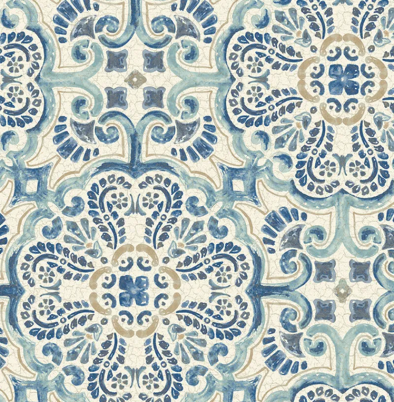 Flowering navy and light blue medallions blossom against a distressed white background in this tile inspired design. A metallic sheen adds a glamorous touch to its Moroccan style. Bayard is an unpasted, non woven wallpaper. Pattern 2922-24046 from A Street Print’s Trilogy wallpaper book by Brewster would make a beautiful addition to any room in your home!